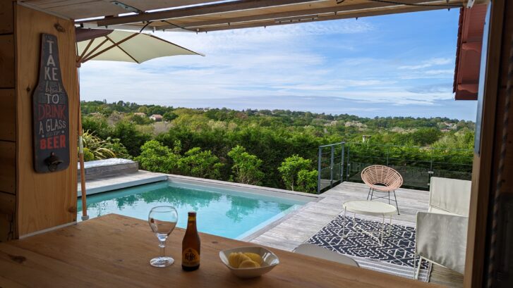 Il y a de forte chance que vous utilisiez cette pièce extérieure à la maison par sa situation avec vue sur la piscine et table bar.